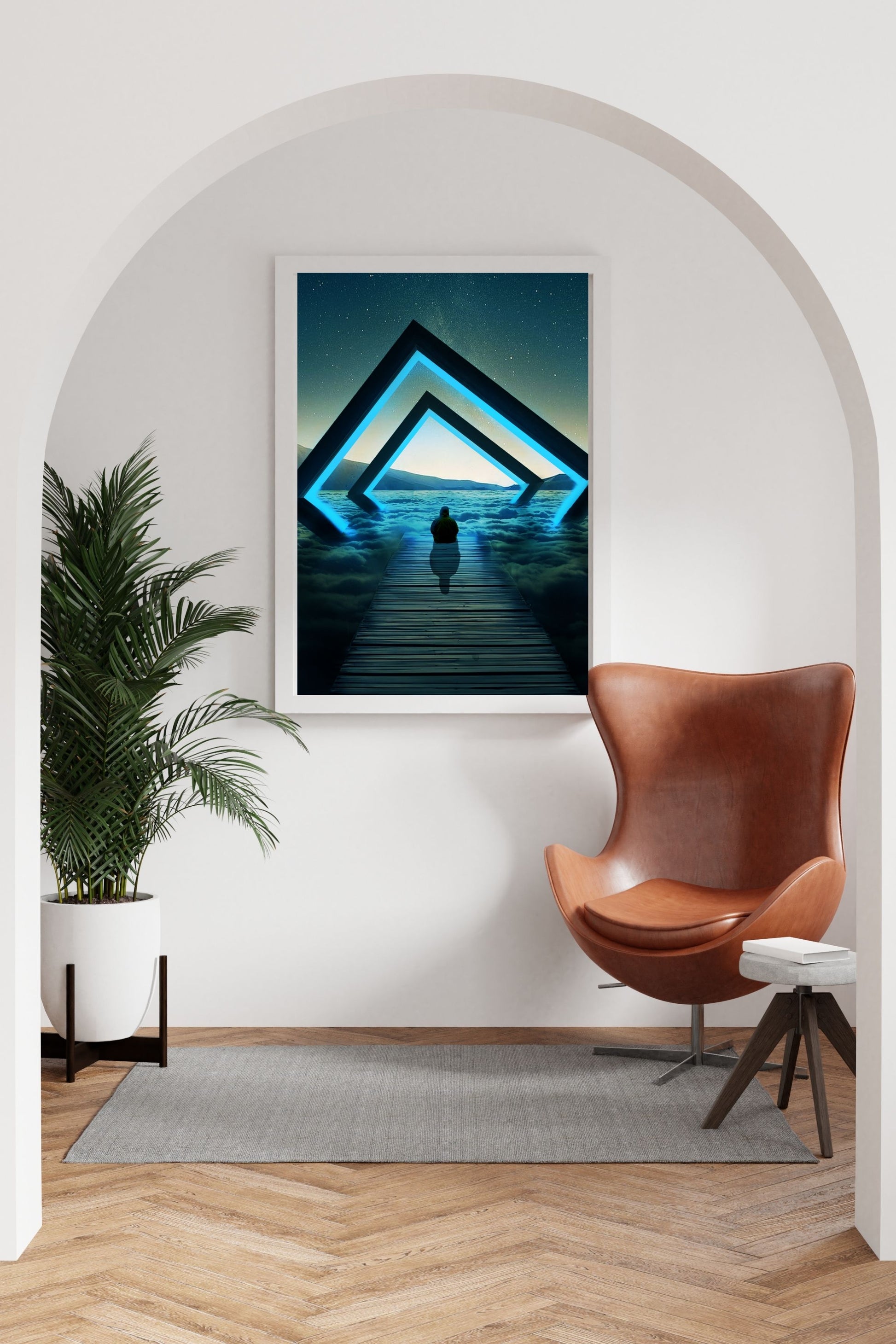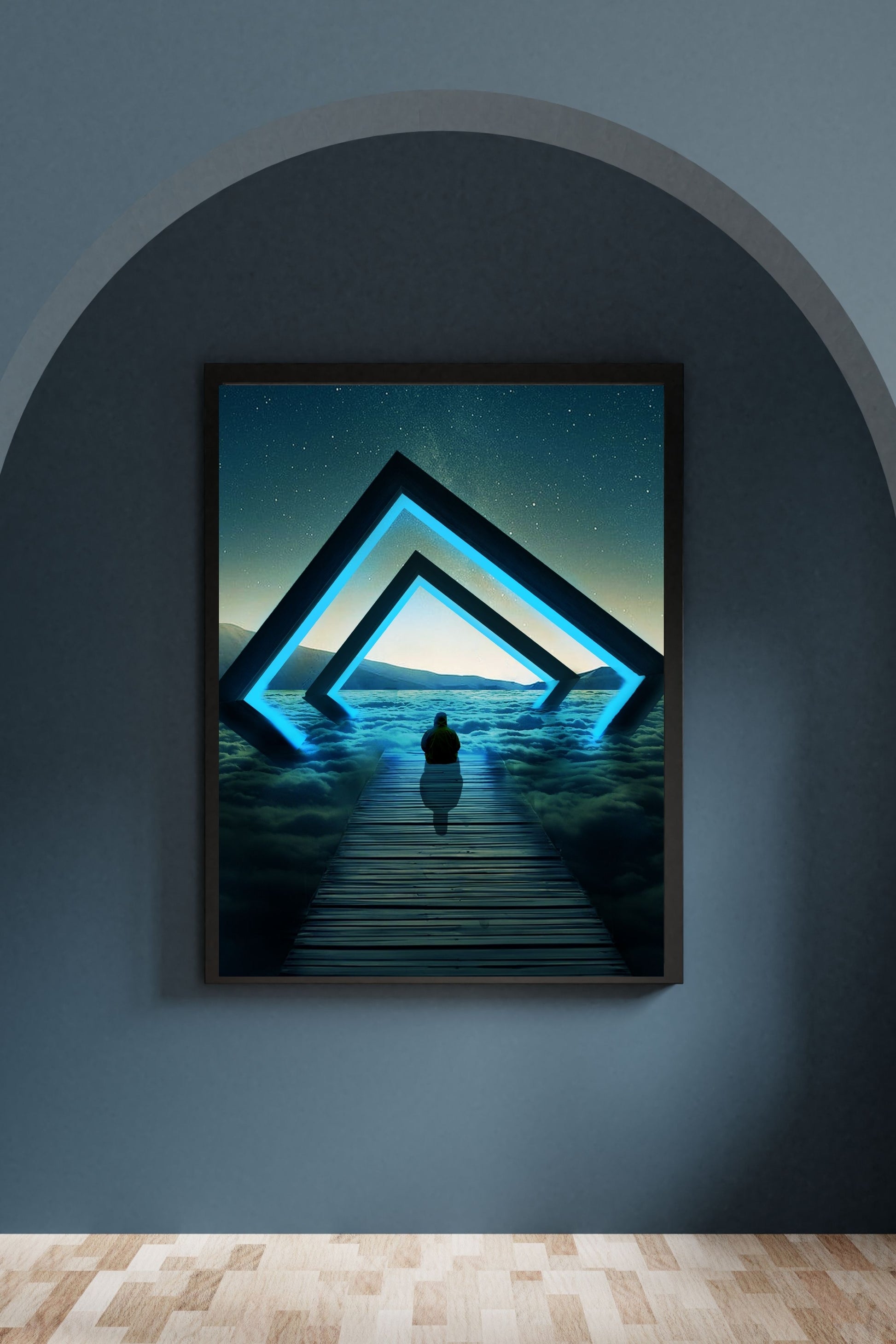 A lone figure sits on a suspended path above a sea of clouds, gazing through glowing neon-blue portals that frame a cosmic horizon. This piece evokes a sense of calm, introspection, and forward motion—perfect for those drawn to mystical, meditative, or futuristic visuals.