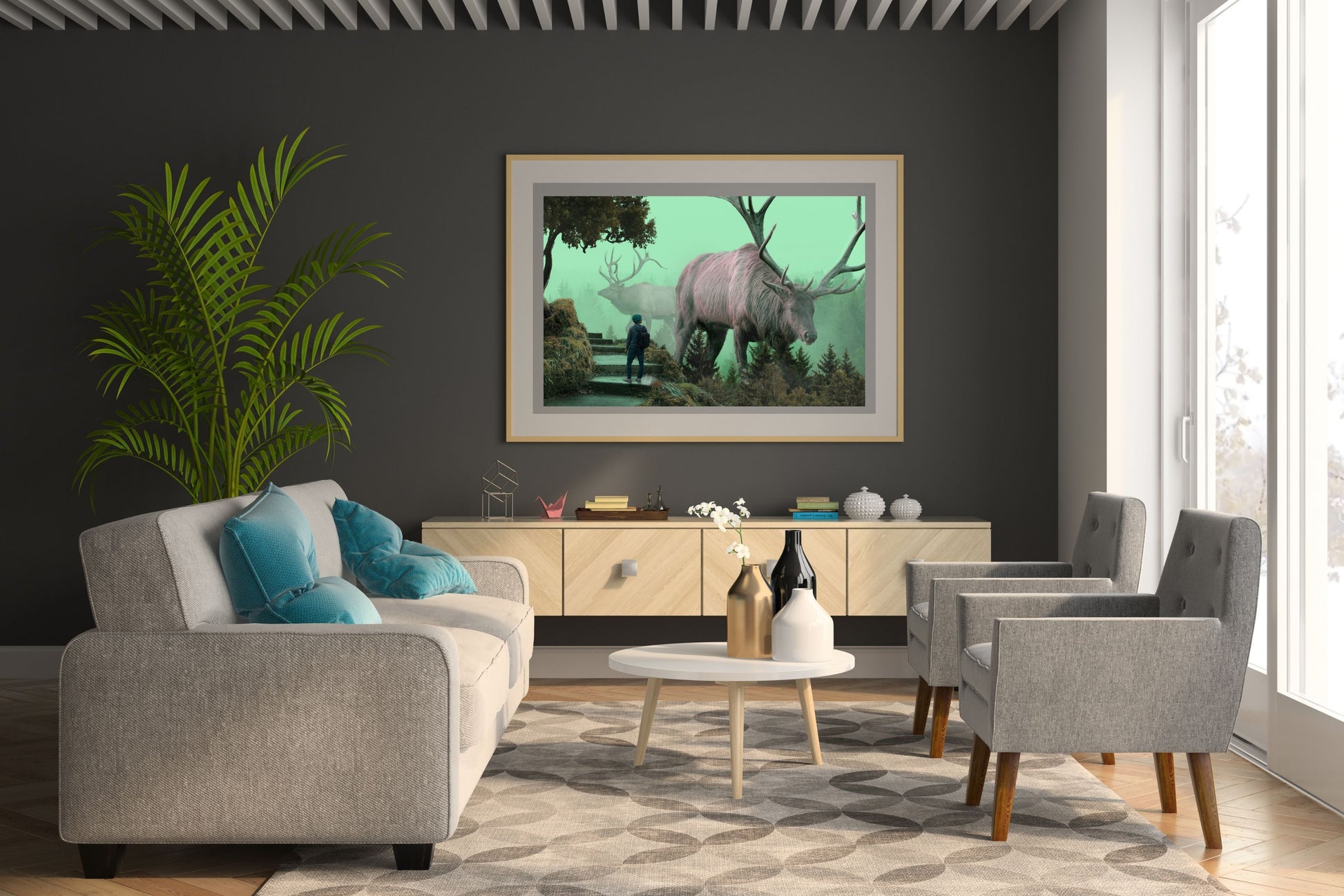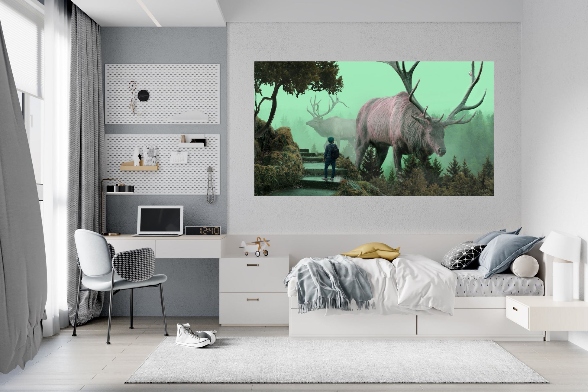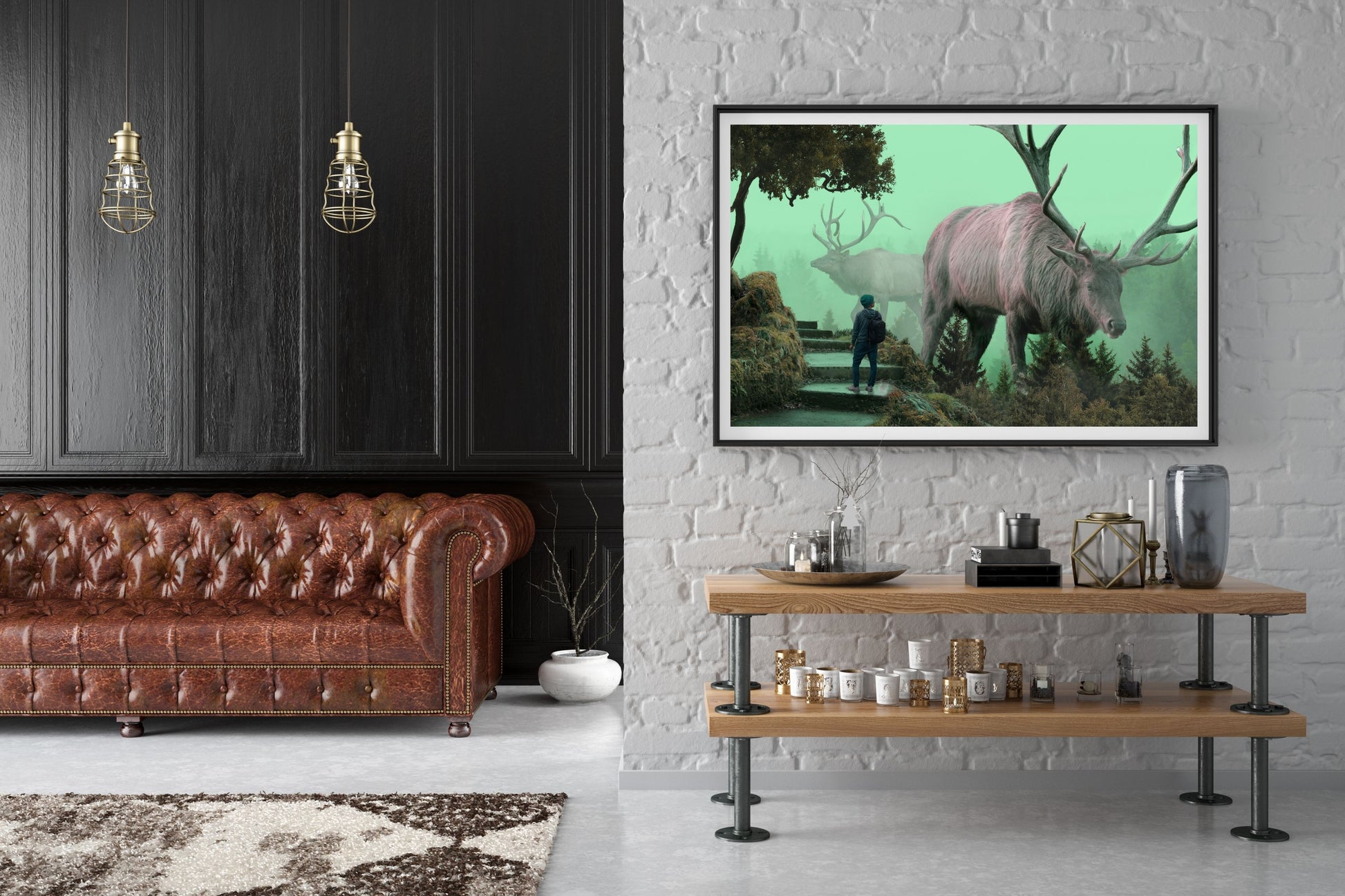“Giants of the Fog” is a surreal digital artwork capturing a lone traveler’s awe-inspiring encounter with towering elk-like creatures emerging from the mist. Set in a lush, moss-covered forest, this atmospheric scene balances the mystical with the majestic, evoking a sense of wonder, solitude, and quiet reverence for nature’s imagined scale.