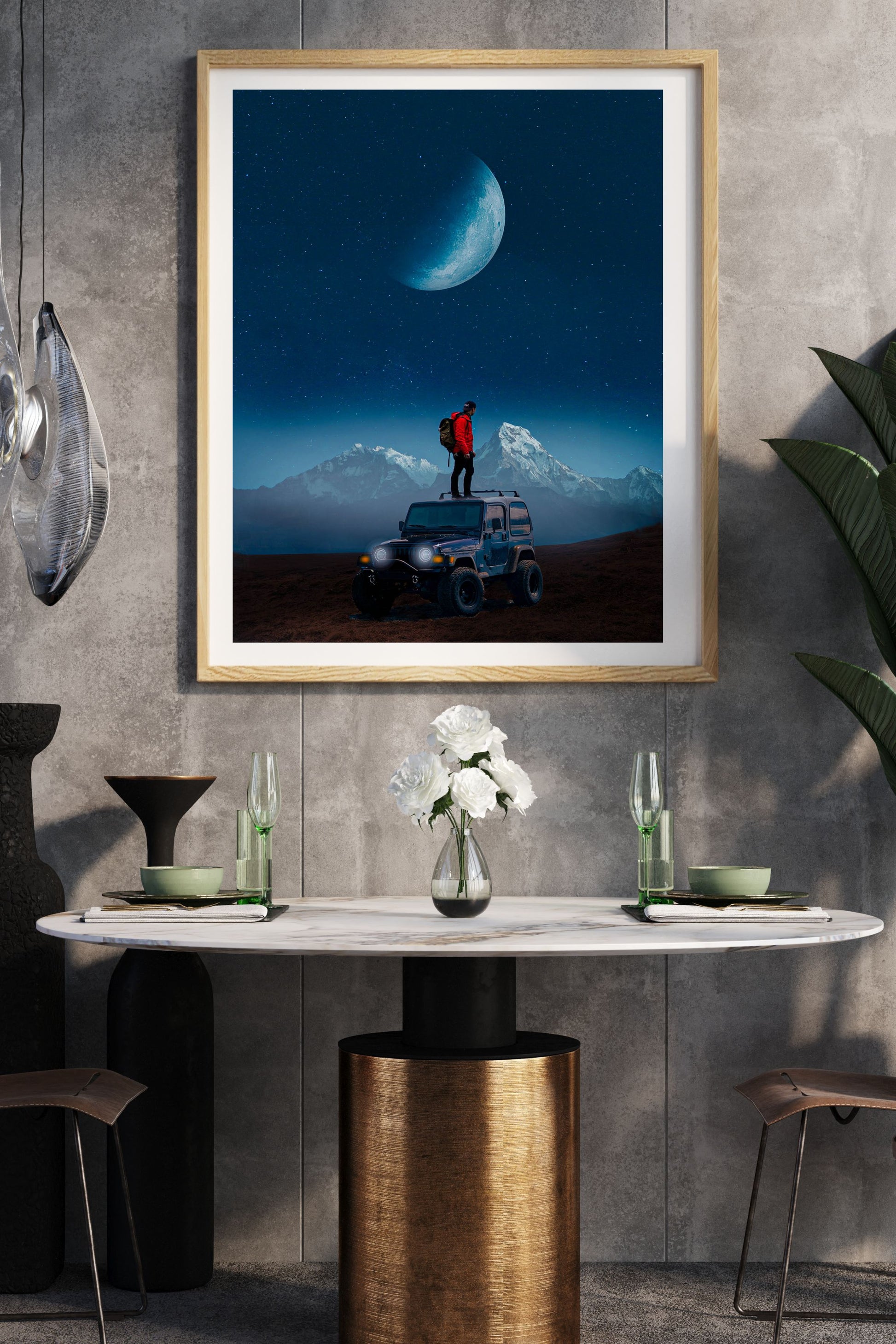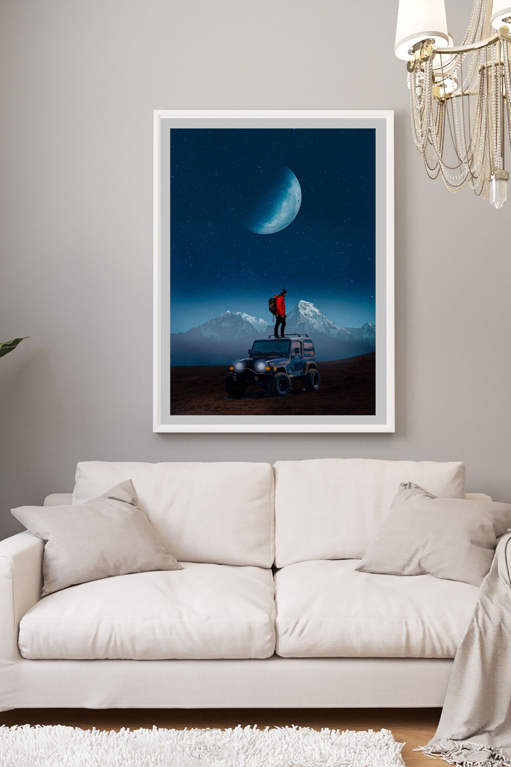 This surreal artwork features a lone adventurer standing atop a rugged 4x4 vehicle, set against a breathtaking night backdrop of towering mountains and a massive crescent moon. With deep blues, crisp detail, and a dreamlike atmosphere, this piece evokes wonder, freedom, and exploration—ideal for any living room, office, or creative studio.