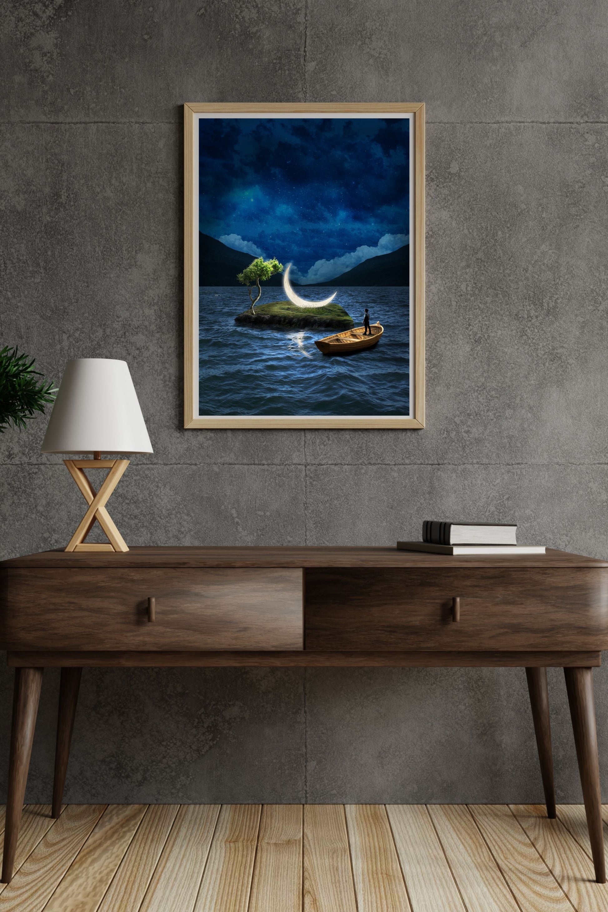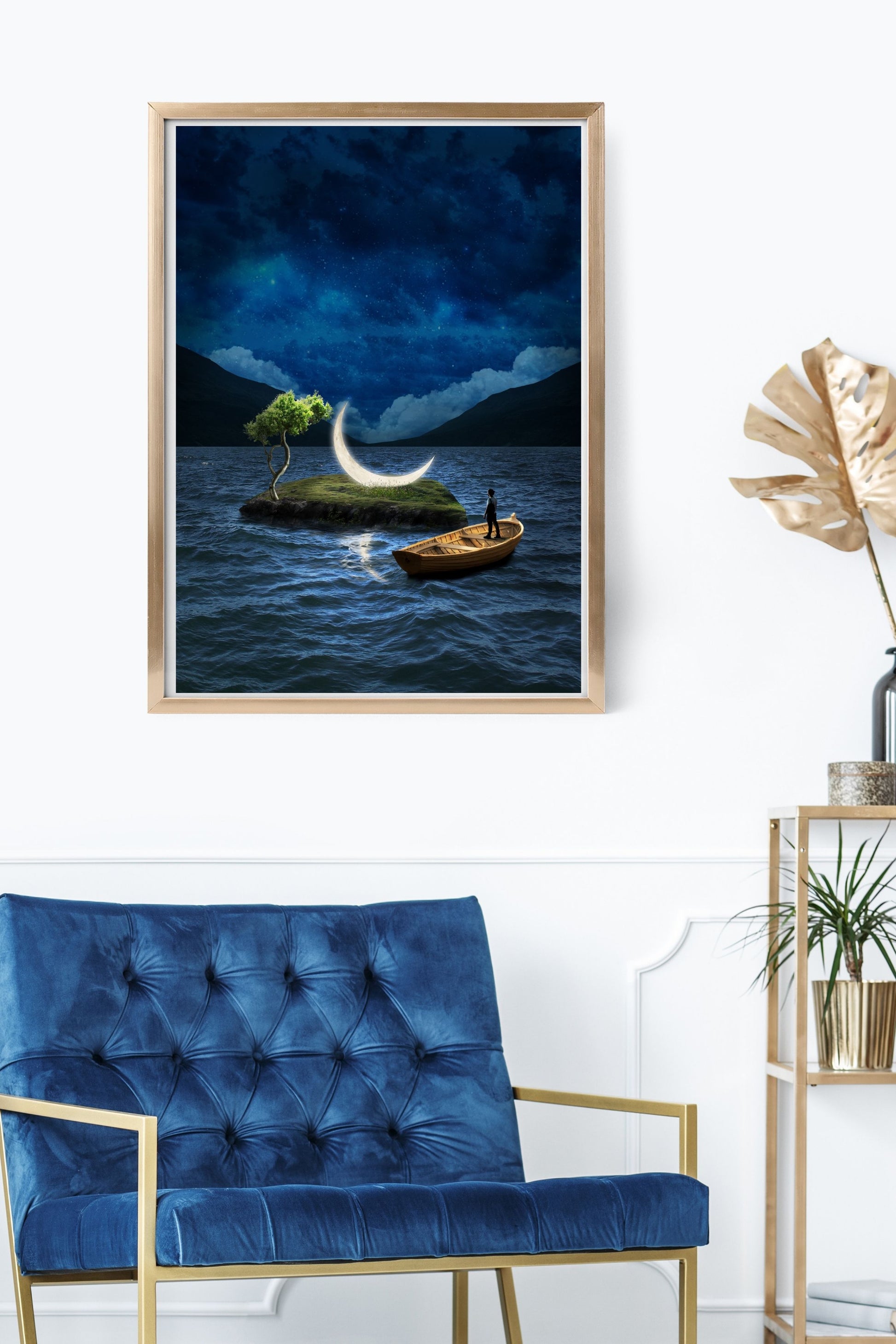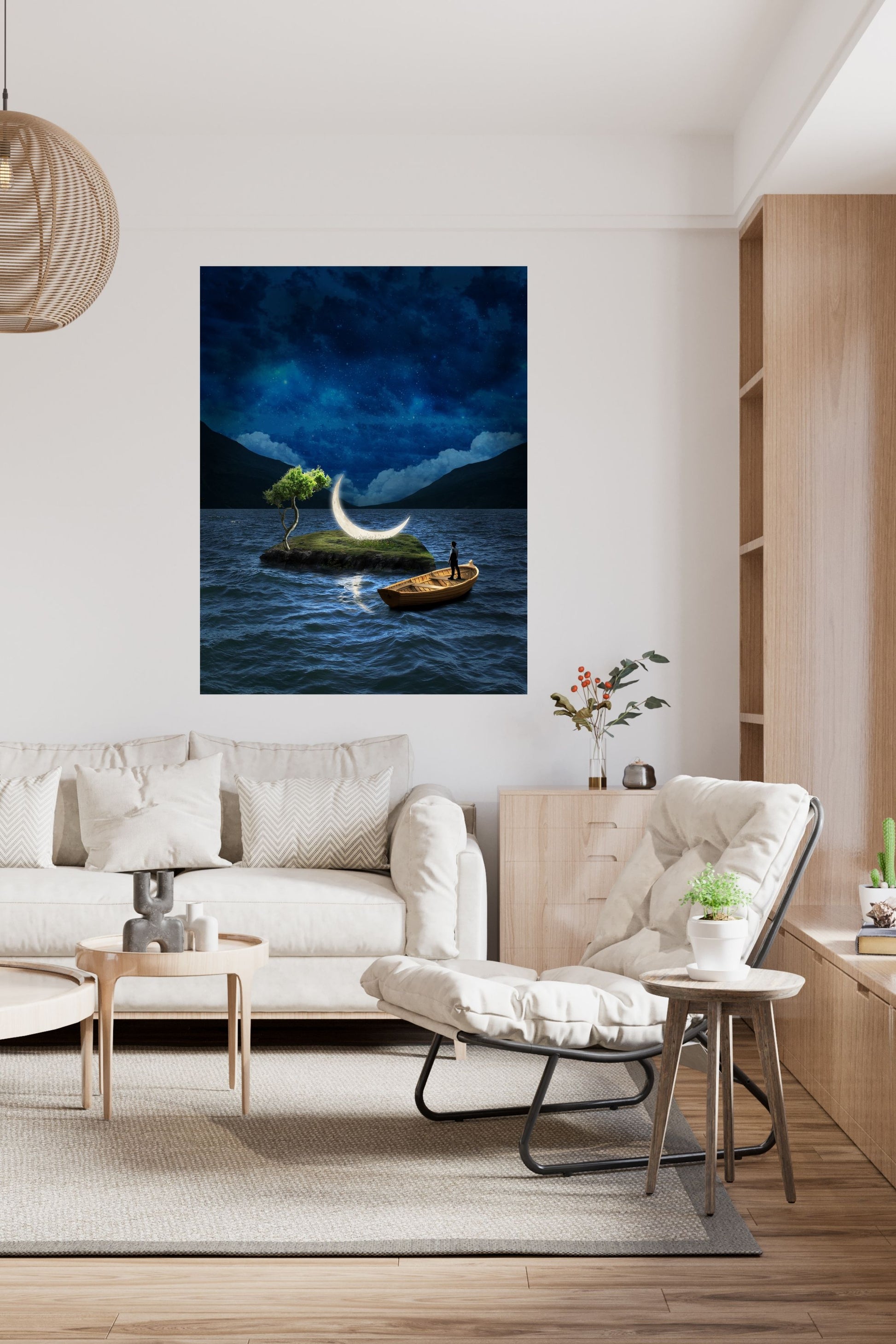 A quiet boat drifts toward a small island, where a glowing crescent moon rests beside a lone tree under a starlit sky. "Moon Landing" captures the magic of dreams, solitude, and cosmic wonder in one peaceful scene.